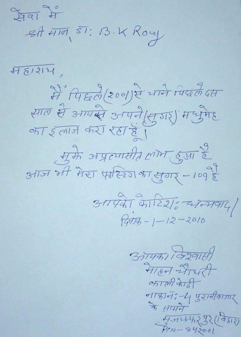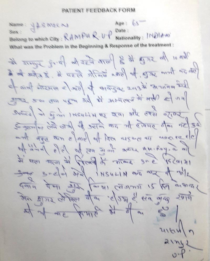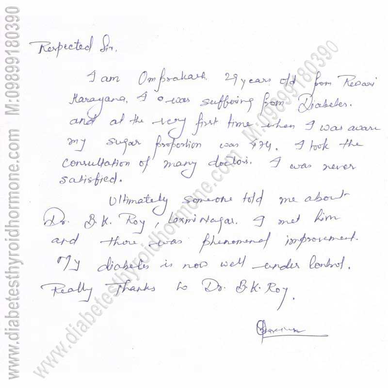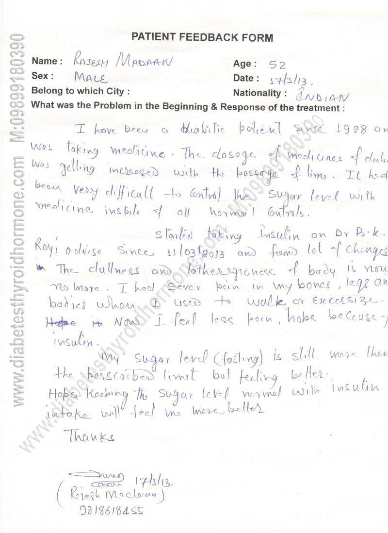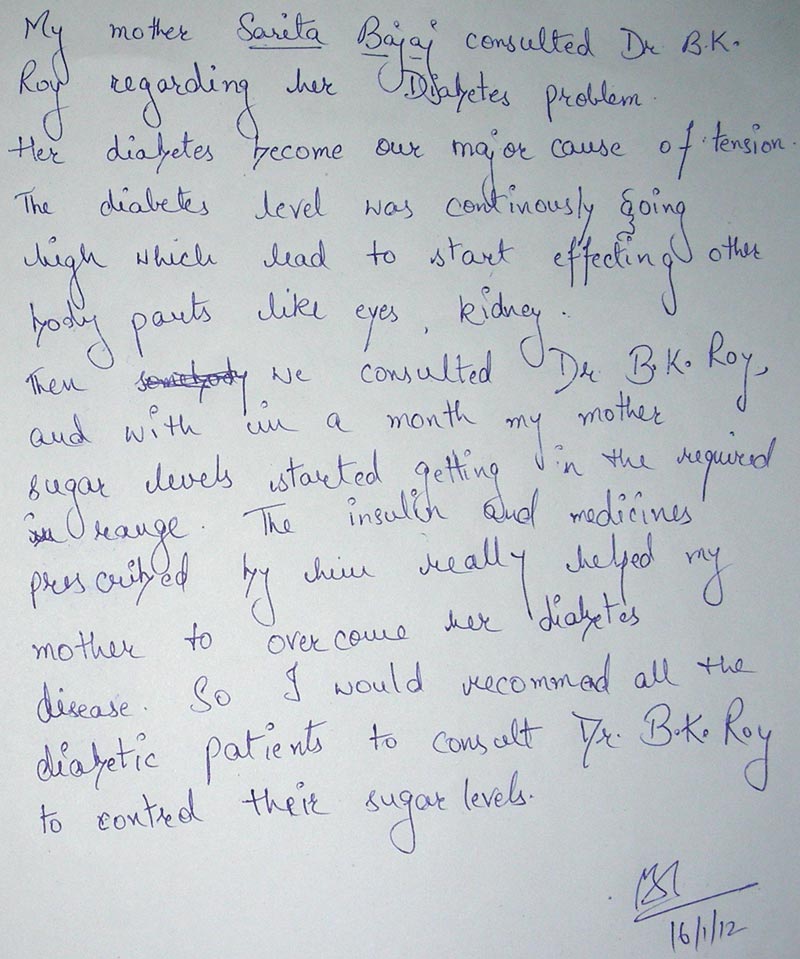 smoke. What Exercise? Walking: best especially if you can do brisk walk for 30-60 min. Jogging, Treadmill, Swimming, Playing Badminton or other game. How Often? Daily/or at least 4 days per week. What time? Excellent time of exercise is before breakfast but can also be done before dinner. � If you want to do intense exercise � get fitness by getting your Treadmill Test done especially if your age is above 35 or have heart disease or have diabetes for more than 10 yrs. � Do 10 min. warm-up, 20-30 minute of active exercise & finally 10 minute of cool down phase. � Remember at time of exercise insulin should not have been given in exercising limb. � If going on a new non-routine exercise, check your blood glucose before & after exercise & during exercise (every 30 minute) if it is prolonged exercise. � May need extra food for 30 hours after prolonged or heavy exercise. � If doing new exercise either decrease short acting insulin before exercise or eat 20 gm. Carbohydrate every 30 minutes. Precautions Regarding Exercise � Use well fitting canvas shoes or sport shoe with laces. � Don�t exercise if blood sugar is uncontrolled (Bl. Sugar >300 ml/dl) � If you have Heart problem � don�t do wt. Lifting, strenuous exercise. � If severe eye problem � should not do heavy lifting, head low positions & excess head jerks, jogging, Racquet - sports. � If you have lost sensation in feet � check feet more carefully after exercise, avoid treadmill, prolonged walking, jogging, step exercises. � Patient with Diabetic kidney involvement � should not do heavy strenuous exercise as it worsens nephropathy. � Should carry diabetes identification card & source of readily available carbohydrates to treat hypoglycemia. � If feel low blood sugar take some carbohydrate. The five groups of medications used for diabetes control are: 1) Those medicines which improve the insulin secretion in the body 2) Those medicines which improve the action of insulin on liver 3) Those medicines which improve the action of insulin on muscles 4) Those medicines which decrease the absorption of glucose from the intestine into the blood. 5) There are many new drugs are available which controls diabetes well as prevent complication 6) There are many new drugs are available which are very effective in preventing diabetic complications. Why inspite of taking tablets diabetes is not controlled? Possible causes may be: - If tablets have failed & you don't want to take insulin there are some newer drugs which can control diabetes in many. But these have to be used under Diabetes Specialist supervision. What are the modes of Insulin Therapy: Now the availability of insulin sprays & jet injectors have made insulin therapy painless. Thus more & more patient are happily taking insulin therapy due to comfort of insulin therapy. At present insulin therapy can be started by any of the below mentioned five methods: a) Insulin Spray b) Insulin jets c) Insulin Nose Spray d) Insulin Pulmonary Spray e) Oral Insulin Spray f) Insulin Injections g) Insulin Infusion Pumps Future Newer insulin therapies which have not come in market ,but are expected to be available for patient treatment soon are: 1) Oral Insulin Capsules 2) Artificial insulin secreting pancreas 3) Islets cell transplant 4) Stem Cell Transplant When to Start Insulin: We must start the insulin if blood sugar targets arte not achieved inspite of maximum dose of tablets. We first try newer drugs if that also fails then one should take insulin for short time say 2 to 3 months. Newer Drugs to avoid insulin & stop insulin injection Newer Tablets: There are many new drugs have been launched in western countries USA & UK which are very effective in controlling diabetes even when our available oral tablets have failed. There are many medical stores in Delhi which make these medicines available to patients on order. Thus if tablets has failed & you don't want to take insulin there are some newer drugs which can control diabetes in many. Misconcept About Insulin This is a Misconcept that once insulin started it can never be stopped. But It is Wrong, in 80% cases insulin can be stopped after 2-3 months of insulin therapy. How? Because insulin forming organ pancreas gets rest by giving insulin injection from outside. In 2 to 3 months, body is able to repair the pancreas & it again stars producing enough insulin to keep blood sugar in normal range. Thus once tablet fails insulin should be started. After three months of insulin therapy patient can again be shifted on tablet. In majority of cases (i.e. in approximately 80% people) insulin can be stopped later after a short course. Side effects of insulin are weight gain, hypoglycemia (i.e. low blood sugar), and edema over body & sometime insulin allergy i.e. itching & pain, nodule at injection site. But if given by Diabetes specialist, chances of side effect are less. Insulin therapy in insulin dependent Diabetes. There are three newer insulin which are very effective in IDDM especially in young children because they can be injected after food & they are painless. Why in some inspite of insulin diabetes is not controlled? Possible causes may be:- � Insulin being given may not be right one. � Inadequate doses. � Insulin not being injected properly � Wrong site � Wrong technique � Injecting at same site � Other causes as stress, steroid, hormonal disorder. Remember in upto 50% patients who are taking insulin still there diabetes is not controlled because they are doing one of the above mistakes. So you need to meet us to find out the exact cause of uncontrolled diabetes. Insulin Injection Techniques: � Wash hands with soap water. � Mix insulin by gentle shake & rolling. � Take the required amount of insulin in syringe, roll that syringe on palm to bring at room temp. � Clean injection site & allow to dry. � Pinch a fold of skin. � Inject at 45� to 90�. � Withdraw needle, apply pressure. �